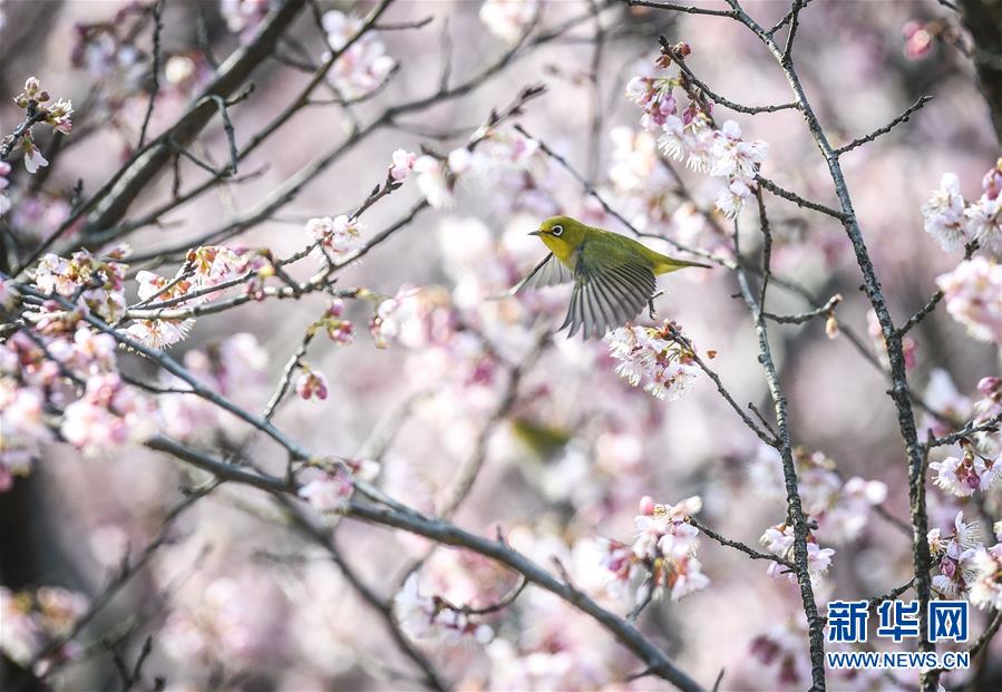 2月28日,一只绣眼鸟飞翔在樱花丛中。