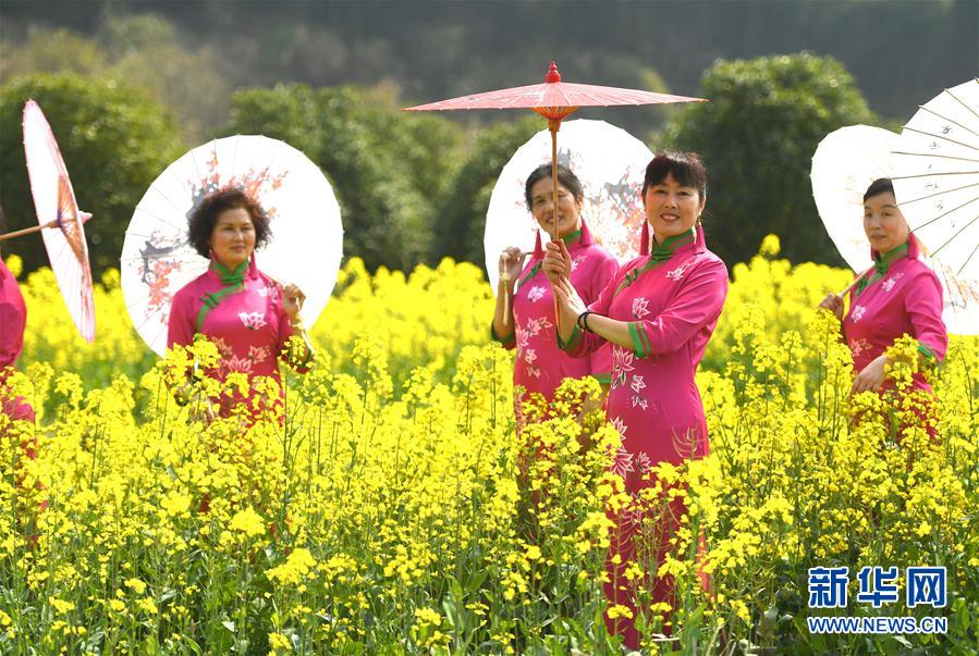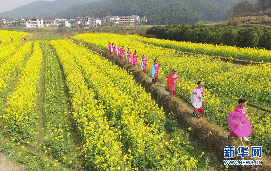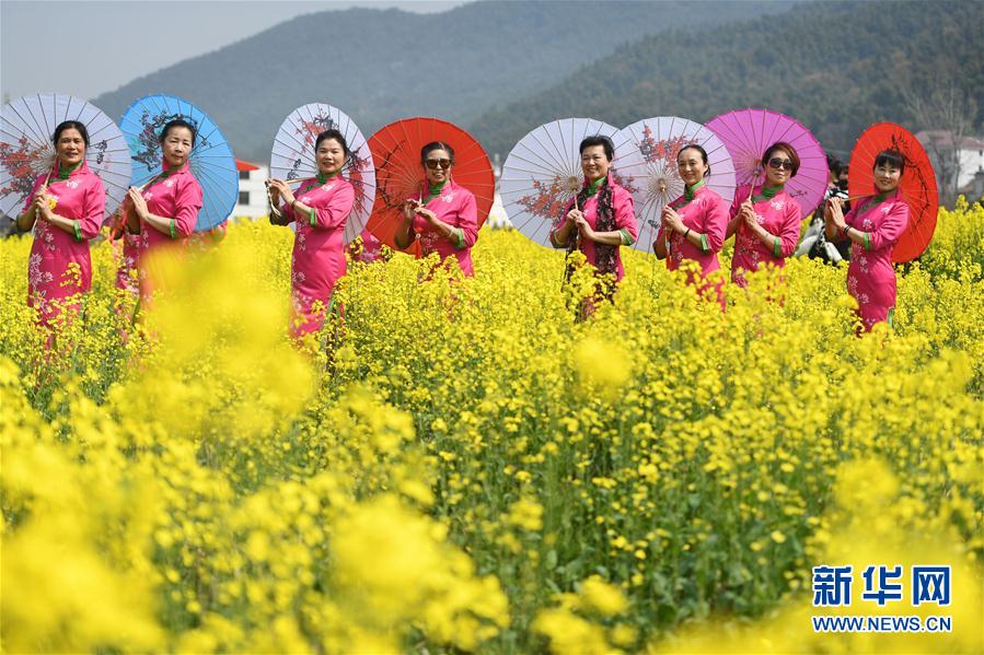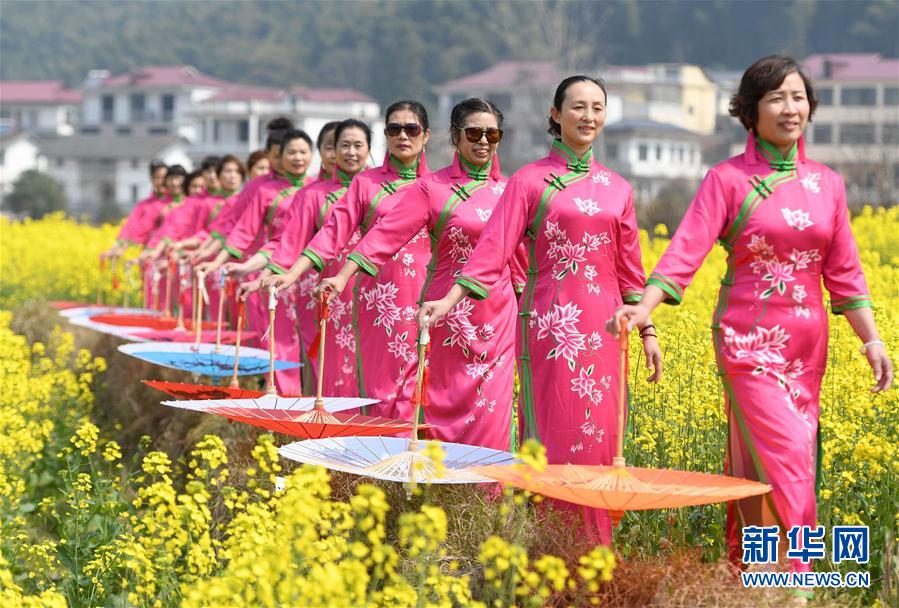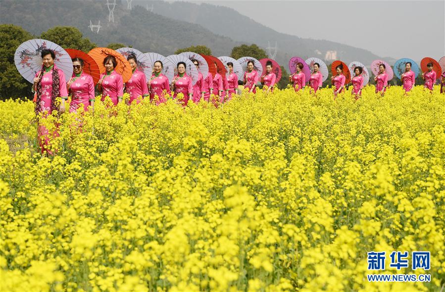 3月8日,旗袍队在油菜花田中表演旗袍秀。当日是“三八”妇女节。一支老年旗袍队在江西省南昌市湾里区太平镇狮子峰景区的油菜花田里,上演一场别开生面的“花田旗袍秀”,吸引众多前来赏花的游人驻足观看。新华社记者 万象 摄