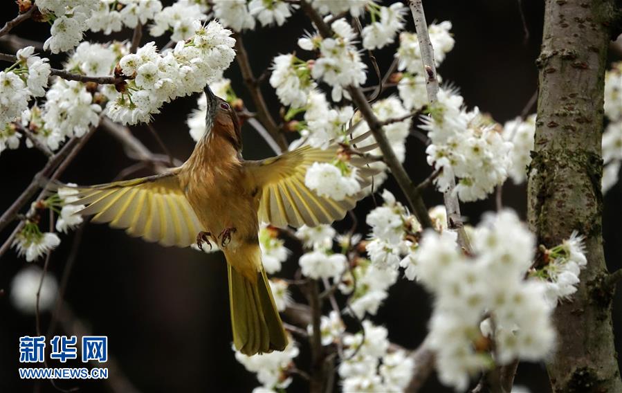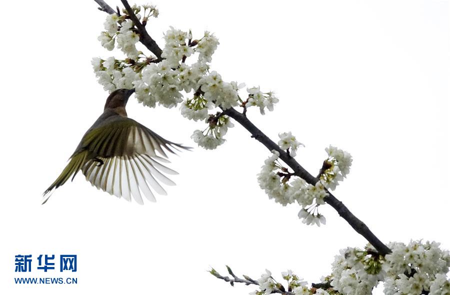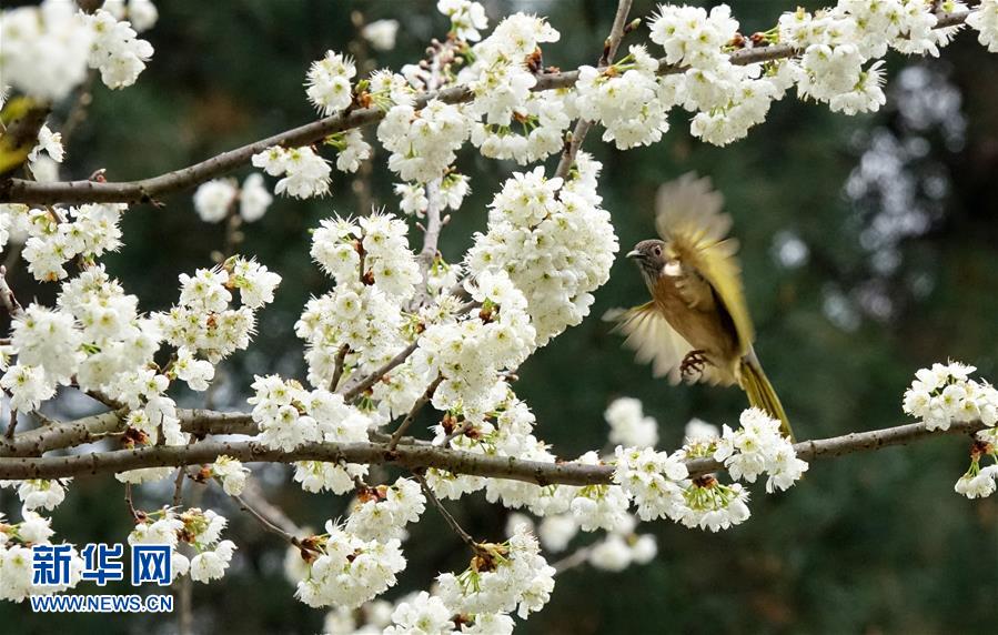 阳春三月,一只小鸟在贵阳市郊贵州植物园的花丛中觅食啄花。 新华社发(秦刚 摄)