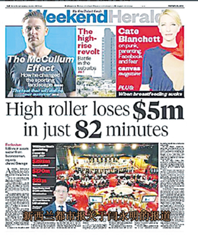 《新西兰先驱报》2016年2月20日以《豪赌客82分钟输掉500万新元》为题,报道了原吉林通化金马药业股份有限公司董事长闫永明,近期在奥克兰的天空城赌场一掷数百万新元,在82分钟内就输掉将近500万新元的事。目前警方已以闫永明涉嫌洗钱将其控制。
