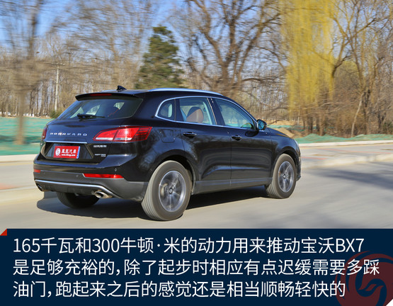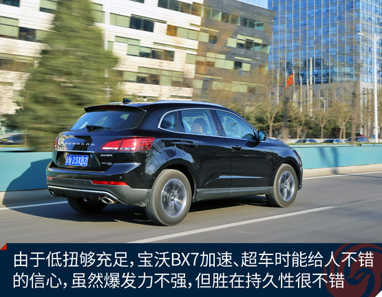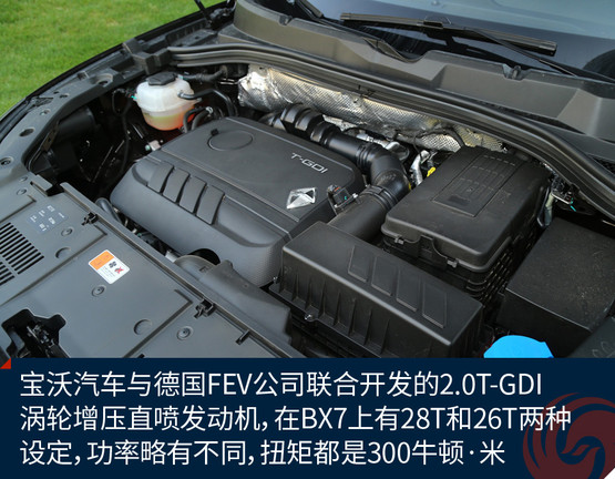动力方面宝沃BX7拥有一台2.0T涡轮增压直喷发动机,目前在售的均为高功率版本,拥有165千瓦的最大功率和300牛顿·米的峰值扭矩,这台2.0T发动机是宝沃联合德国FEV公司共同研发,最大功率数据可观,但峰值扭矩因为变速器能承受最大扭矩的限制被设定得略微保守,可见这还并非这台发动机的全部潜力。令人欣慰的是,这台2.0T发动机峰值扭矩在1500rpm即可输出,这个优点让它在低转速区即可有充沛的牵引力,驾驶起来显得更加轻松,超车的时候信心十足。