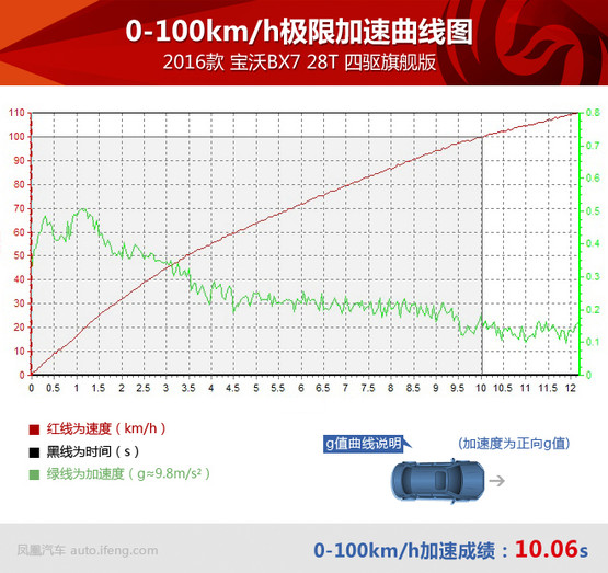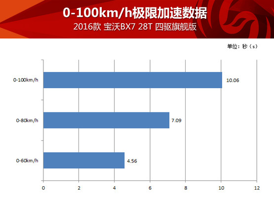 由于有四驱系统保障,宝沃BX7四驱版车型在全力加速起步瞬间非常平稳,6AT变速器换挡还是平稳优先,所以全力加速时升档也没有太明显的顿挫、动力中断或者不平顺,整个过程很舒服,而10秒出头的测试成绩对于这台2.0T动力的中型SUV也很不错,请别忘了因为与变速器的匹配,这台2.0T发动机的扭矩被限制在300牛顿·米,也就是说这台“高功率”发动机其实并没使出全力,我们完全有理由相信解除封印后它理应跑得更快。