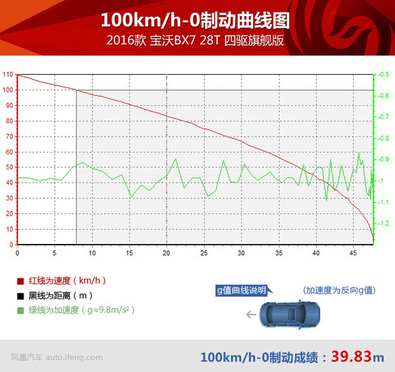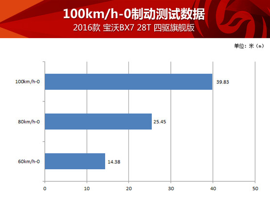 加速过后就要减速,宝沃BX7的制动系统在测试中经受住考验,不到39米的成绩对于一台SUV而言已经算是很不错,而且多次测试并未出现制动力有衰减的现象。