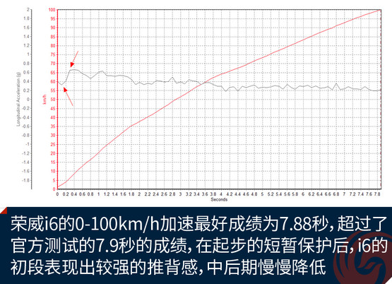 在动力方面,荣威i6搭载了上汽“蓝芯”SGE 20T发动机,采用缸内中置直喷涡轮增压、高效气门配气机构等国际领先技术,配合TST 7速双离合变速器,荣威i6最大功率169马力,比朗逸、轩逸和领动分别高出了59马力、43马力、39马力。而实际测试中也证实了这一点,荣威i6在加速和刹车方面确实领先于竞品车型。7.88秒的0-100km/h的加速成绩确实让人大吃一惊,荣威i6表现出了极高的运动化调教。刹车方面,荣威i6也表现相当出色,36.59米的刹车距离,可以跟一些性能车相提并论。300mm的通风刹车片功不可没,整个制动过程有力平稳,车身悬挂对于点头的抑制也很到位。