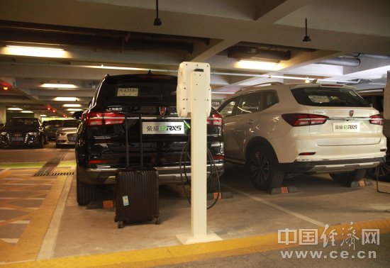 在上海虹桥机场的停车楼,由两排充电桩构成的专属停车区甚是醒目,专属停车位上的荣威eRX5车头标志闪烁的呼吸灯表示车辆正处于充电状态。