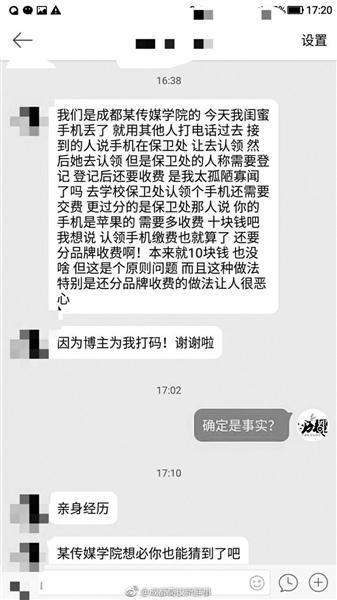 认领丢失物品需要交费,四川传媒学院近日设立的“失物招领费”在学子中引发争议。日前,该校党委宣传部副部长孙浩睿告诉北京青年报记者,学校并非强制收费,收取的费用将作为对捡拾者的奖金。对此,法律人士表示,制定失物招领收费的规则不违法,但如果校方强制收取,则涉嫌侵犯学生财产权,是违法行为。 网曝 到保卫处认领丢失手机需缴费10元 近日,四川传媒学院有学生在网上爆料称,自己陪同学去学校保卫处认领丢失的手机时,保卫处的人员称需要登记并收取费用,且不同手机要分品牌收费,苹果手机要收费10元。 四川传媒学院一位学生告诉北青报记者,他没有丢过东西,但身边一位同学确实曾因丢了一部苹果手机,向学校保卫处交了10元的“失物招领费”。关于是否知道学校设立了“失物招领费”,这名学生称“开学第一节课院长就在会议上说过”。 4月7日,四川传媒学院党委宣传部副部长孙浩睿告诉北青报记者,学校设立“失物招领费”, “一方面是对拾金不昧行为的肯定,另一方面是想利用这种方式给同学提个醒,一定注意保管好自己的东西”。 孙浩睿向北青报记者解释,“失物招领费”并不是强制对学生收取的,“如果学生不愿意承担这部分费用,则由学校来承担”。 对于学校设立“失物招领费”。有网友表示理解,认为学校的出发点是好的,也有人认为 “物归原主是规则”,不应该收取费用。此外,也有网友表示,“收钱不重要,重要的是收的钱怎么用,怎么做到透明化?”