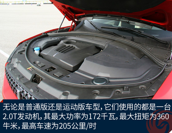 普通版和运动版车型只提供一套动力系统,发动机是一台2.0T直喷发动机,技术上采用了双流道涡轮增压以及缸内直喷技术;其最大功率为172千瓦,最大扭矩为360牛米,这台发动机跟哈弗H7上的是一样的。变速箱方面,新车匹配的是长城自主研发的7挡湿式双离合变速器。