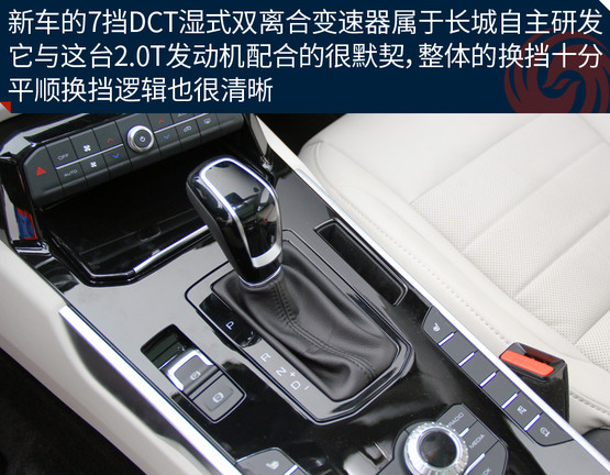 由于涡轮介入的时间稍晚一些,起步时不会让你感觉特别的轻快,但也不会差到让你无法接受,只要保持平常心就好;当这台2.0升的涡轮增压直喷发动机真的卯足了劲发力之后,360牛米的最大扭矩完全不是闹着玩的,后背感觉有人在猛使劲的把你向前推。长城自主研发的7挡湿式双离合变速器是新车的一大亮点,日常驾驶的过程中升降档都有着不错的平顺性,不过起步初期离合器结合的速度还是稍微有一些慢,急加速时变速箱的反应也不够灵敏,这在一定程度上拖累了整体的动力表现。