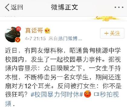 云南网讯(记者 关喜如意)一位女学生用木棍击打另一位女同学并搧了对方12个耳光,近期有网友发布了这样一段学生对学生施暴的视频,4月10日,记者从校方获悉,两位同学已经和解。 视频显示:木棍击打加搧耳光 一女生在校园施暴 记者从网友发布的视频中看到,刚开始一位穿浅蓝色衬衫黑色裤子的女生手持一根木棍与一位穿军绿色风衣的短发女生在争执,旁边不断有男生起哄:“不要动嘴,直接动手。” 穿衬衣的女生用木棍用力击打短发女生的腿,旁边的男生还不断地提醒:“看着点老师,用力。”用木棍打了几次之后,穿衬衫的女生开始搧短发女生的耳光,边搧耳光边用木棍击打对方,视频显示,打人女生共打了短发女生12个耳光。 从视频上判断事发地点为学校走廊,事件发生期间,楼上有多名同学围观,却没有一人出来制止,被打女生旁也另有一位女生在现场,女生被吓得连连后退。 视频录制到第34秒时,终于有一男一女两位同学上前劝阻,围观的男生还起哄不让两位同学“管闲事”。据记者统计,此时短发女孩已经被搧了9个耳光。 周围围观的学生超过了10位,部分同学只是抱着手静静围观。视频时长1分04秒,之后短发女生是否再次受到攻击不得而知。 事件反转:被打女生竟是先施暴者 目前双方已和解 微博报料显示,该学校为云南省昭通鲁甸桃源中学。4月10日早上,云南网记者从鲁甸宣传部获悉,被打女孩是该校初二年级的同学,打人者是初三年级的学生,被打女生的家属于事发当天下午来到学校,和被打女生一起找到了打人者。 打人的初三女生班主任孔老师正在上课,知道情况后,孔老师便把当事人带到学校保卫科进行矛盾调处。 经过询问发现,两位同学因琐碎小事引起争吵。4月4日晚上,初二短发女生率先纠集镇中多位学生打了初三的这位女生,为了报复,初三女生于4月6日下午休息时,在教学楼四楼上打了短发女生,也就出现了视频中的情况。 随后学校及时通知了两学生的家长到校处理此事。最终,两位学生及家长经调解后和解,互相原谅,且承诺今后不再发生此类事情,班主任老师代表学校对他们的行为进行了严厉的批评教育,同意他们和解,并告知今后不允许发生此类事件。 网友热议:校园暴力何时了 WYX平凡一星:校园暴力何时了!!?一个女生竟然如此凶狠!围观的众学生怎么没一人出来劝架!学校怎么不管?! 谦欣卐苦:现在的孩子们你们都怎么啦?打行出生么?这是在学校,目无老师,老师的威力去哪儿了? 楚楚珺玥:听对话貌似被打的那个之前先打了这个才有今天滴 三老四帅:这两个孩子没一个好的,很普通的事情发上来就变了味道了。 新闻助读: 据最高人民检察院公布的统计数据,全国检察机关2016年共受理提请批准逮捕的校园涉嫌欺凌和暴力犯罪案件1988人,经审查批准逮捕1180人。 2016年11月1日,教育部、中央综治办、最高人民法院、最高人民检察院、公安部、民政部、司法部、共青团中央、全国妇联联合印发《关于防治中小学生欺凌和暴力的指导意见》。 我国规定,十四岁是可以承担刑事责任的年龄,已满十四周岁不满十六周岁的被告人只对八类严重暴力犯罪(故意杀人罪、故意伤害致人重伤或死亡,抢劫,强奸,贩卖毒品,放火,爆炸,投毒)承担刑事责任。所以,未满十六周岁的放在比较轻微的校园暴力行为,并没有进入我们刑事犯罪处罚的程序。 |