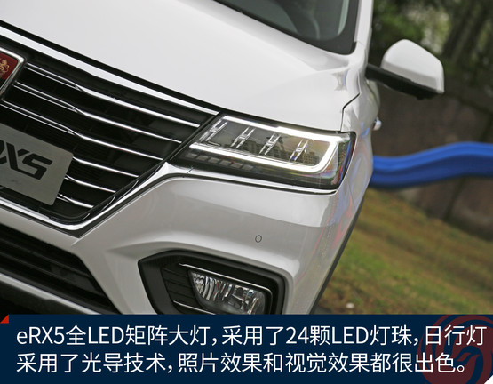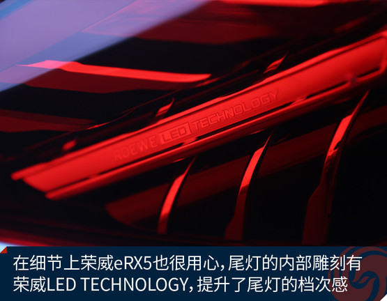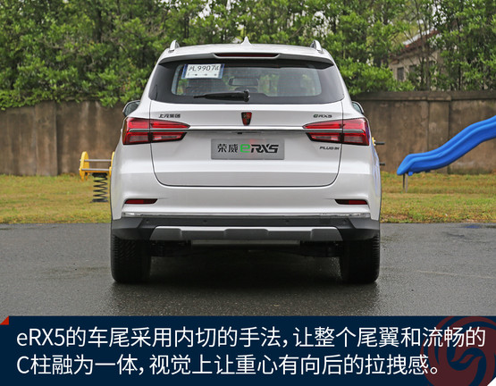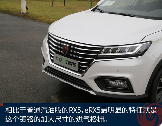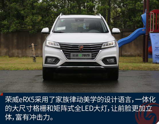 荣威eRX5的外观设计来自于上汽荣威家族最新的“律动设计”语言,整体外观呈现出的是“鲸头燕尾”的特点。通过车头下压、腰线勾勒、尾部内切等设计,诠释了“律动”的美学理念。与汽油版RX5相比,车头的镀铬前格栅尺寸更加大,造型更为舒展,与大灯融为一体。eRX5基于RX5采用的SSA+平台打造,提供了插电版与纯电版两个版本,这两款车实际几乎是同时开发的,尺寸方面更是一模一样。插电版的eRX5车身两侧分别为加油口和充电口,纯电动续航60公里,综合续航650公里。车身随处可见新能源的标识,并且还拥有新能源的专属颜色银叶金。