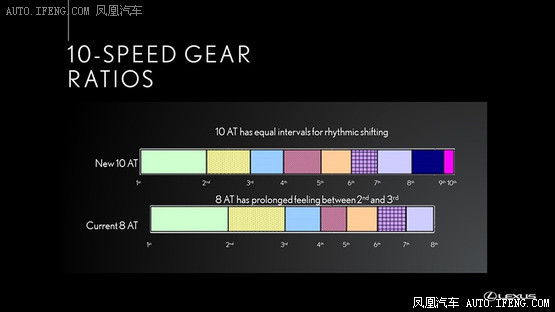与发动机匹配的就是世界上首款10速自动变速器,这款变速器是在8档变速器的二挡和三挡之间增加一个齿比挡位,全部10挡之间保持均匀的齿比间隔,换挡节奏感十分强,而且换挡时间仅为0.2秒,已经达到双离合变速器的水准。