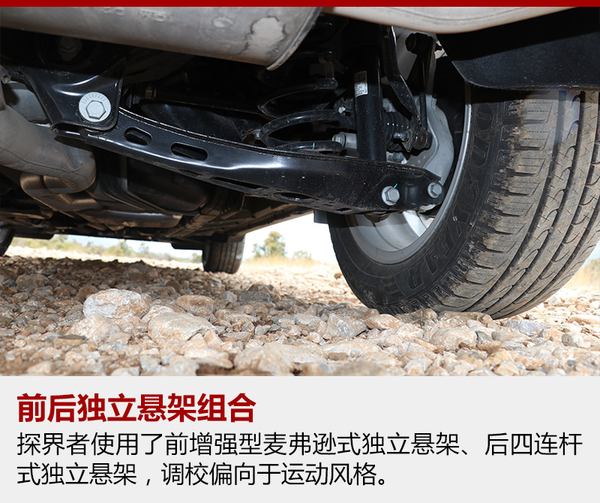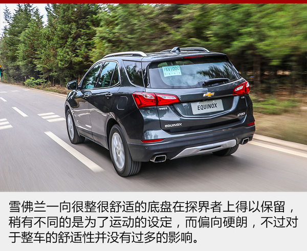 探界者的底盘受到雪佛兰运动倾向的影响,被调校的有些偏硬,这样对于车身侧倾的抑制就非常到位,面对路面上连续的起伏,紧致的悬架也带来很强的整体感。但是当面对较大的颠簸或者减速带一类的时候,车身就会产生弹跳的感觉,而且悬架的回弹稍有延迟,总有一次小幅度的二次弹跳,稍稍影响了舒适性。