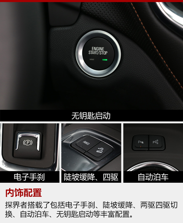 探界者与昂科威相似的尺寸与轴距面对其主要竞争对手其实并没有任何优势,不过考虑到其更加实惠的售价则完全可以接受,另外从实际的空间体验来看也没有过多受到这些毫厘之差的数据的影响。