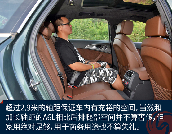 作为中大型豪华车衍生的旅行轿车,A6 Avant提供了充足的乘坐空间,当然后排不会像加长轴距的A6L那么奢侈,不过作为商务接待并不嫌失礼。身高180cm的人在后排足够舒适,加上旅行车车顶轮廓高挑,后排乘客头部空间还优于三厢轿车。