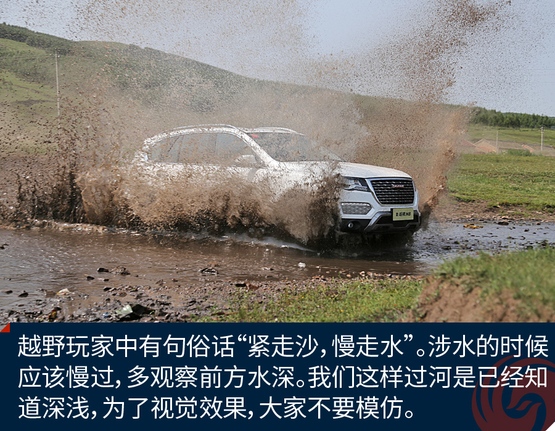 涉水测试对于新哈弗H8来说简直是小菜一碟,190mm的离地间隙,500mm的最大涉水高度,这条小河完全阻挡不了H8的脚步。俗话说“紧走沙,慢走水”是对于路况不清楚的水域,万一进气系统进水,发动机就会熄火。所以一定要小心涉水深度。像我们这么莽撞的压水花,是在水域已经探明的情况下。