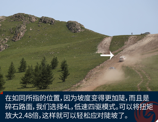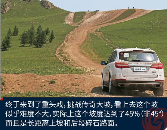 经过刺激的涉水越野,我们终于来到了此行最难的挑战地,传奇大坡。这条上山的土路从图片上看起来不陡,实际上已经达到了45%的坡度。人爬起来都气喘吁吁。而且难度大的原因是两点,一个是超长距离的大上坡,另一个是后端是碎石路面。你想靠冲坡根本行不通,如果动力不足最终是无法登顶的。H8不仅动力充沛而且有4L,低速四驱模式,而且博格华纳双速TOD可以随时分配动力传递到前后轴,保障了有抓地力的轮胎有驱动力。