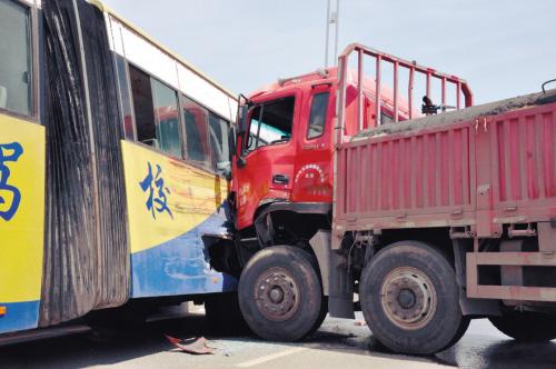 昨日12时许,记者赶到事发地点:浑南西路与沈苏西路交会处的浑河站桥。只见一辆红色车身的运水罐车与一辆蓝黄相间的大客车相撞!