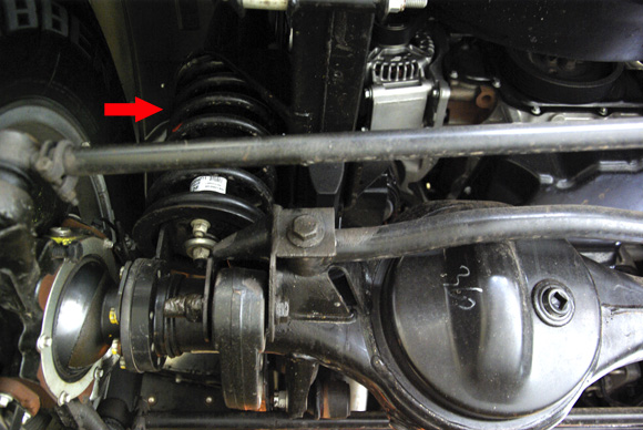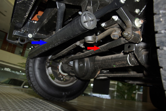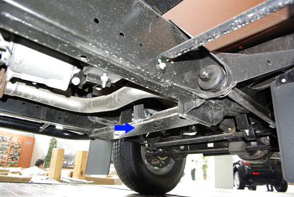 后轴特写图二,蓝色箭头所指为拖臂,红色箭头所指为后防倾杆,对于卫士的车重而已,其粗细不能提供很好的仿侧倾效果。后轴依然采用螺旋弹簧作为弹性元件。