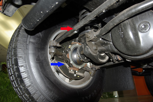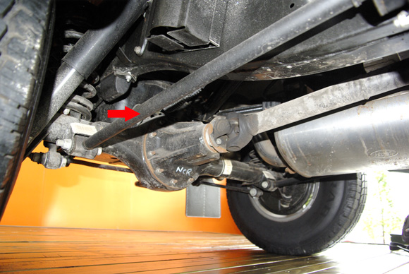 上图为前轴转向系统特写,红色箭头为转向拉杆,它负责拉动前轮产生左右的转向。卫士的转向机构比较特别,其羊角与硬轴直接采用了球头的连接方式(蓝色箭头所指),整个羊角包裹住球头,可以产生任意方向的旋转,这比起传统的靠上下转点定位旋转的前轴,前轮的倾角和束角能在更大的范围内活动。