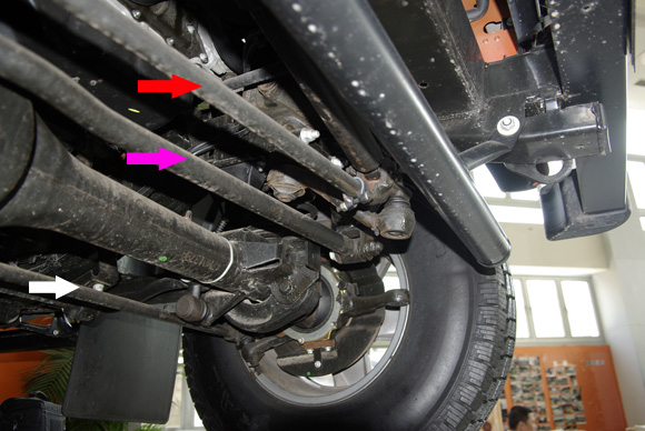 前轴特写二,玫红色箭头为横向推力杆,红色为转向拉杆,白色的拉杆连接左右的羊角,红色的转向拉杆带动卫士的右前轮转向,通过白色的拉杆联动左前轮,使左右前轮同步的进行转向。
