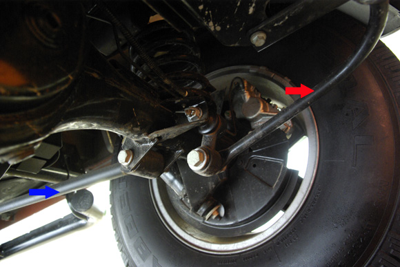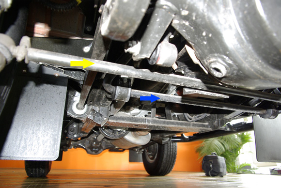 上图中橙黄色箭头为前轴的限位拉杆,不仅限制前轴自身发生扭转,也可对前轴的相对车架的前后位置进行限制。蓝色箭头为前防倾杆,目测粗细并不算大,相信这也跟卫士不看重公路性能有关。