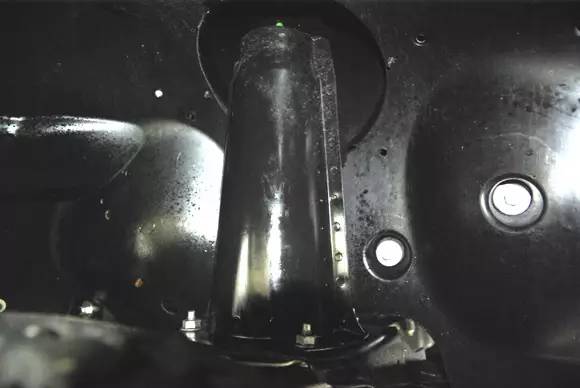 卫士的底盘前视,卫士作为一款硬派越野车,最小离地间隙达到了323mm(从图上可以看到这一最小间隙位于前轴的差速器鼓包处),320mm的最小离地间隙意味着什么?一个人平躺在地面上,卫士能从上方驶过而人不会有任何损伤。相比于一般SUV的200mm左右的最小离地间隙,卫士显然不在一个层级上。