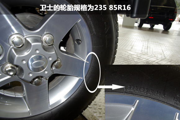 卫士冰火版的轮胎采用了扁平比厚达85的轮胎,胎宽为235mm,纯粹的越野取向,粗大的轮胎颗粒可以应对野外各种地面条件,依然提供可靠的抓地,但面对城市中的柏油路面,则不一定能提供良好的抓地。