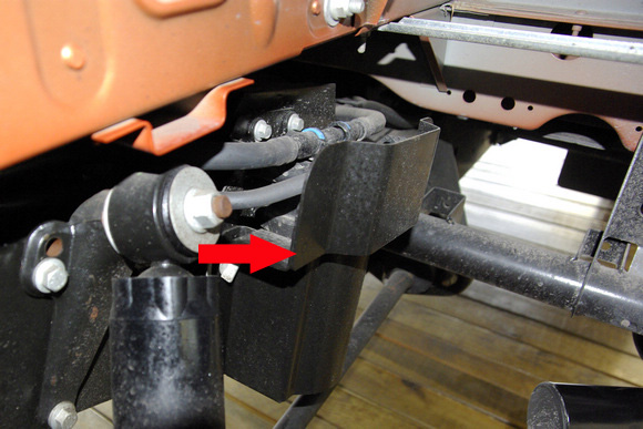细节处,刹车的油管外侧有护板(箭头处)进行周全保护,有效杜绝越野时由车轮搅入的尖锐物体划伤油管。