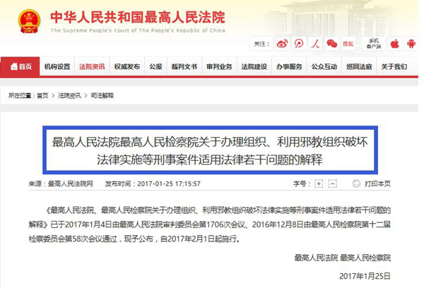 2017年1月25日,最高人民法院、最高人民检察院、发布《关于办理组织、利用邪教组织破坏法律实施等刑事案件适用法律若干问题的解释》,就办理组织、利用邪教组织破坏法律实施等刑事案件适用法律问题作出解释。