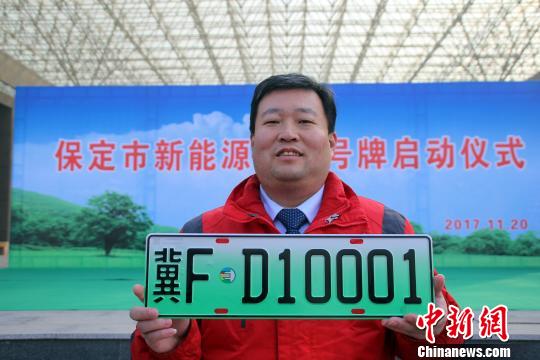中新网保定11月20日电 (吕子豪 于俊亮) 20日,河北省公安厅副厅长刘云峰将冀FD10001新能源汽车专用号牌正式颁给保定市民康辰龙。据悉,该新能源汽车将享受“不限行”的交通管理优惠政策。