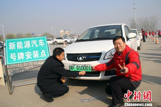 保定市民康辰龙领到该市第一副新能源汽车专用号牌。 于俊亮 摄
