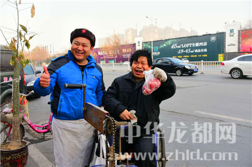 一旁的小音箱播放着歌曲《爱的奉献》,在寒风中让人感到温暖。