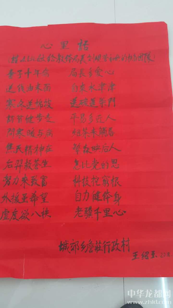 “我推敲了几个半夜,写了《心里话——谨以此献给教体局局长刘现营和他的扶贫团队》这首五言排律,表表我和老伴及全村对您的感激之情。”“妻子十年病,局长多爱心。送钱米油面,自来水津津。寒冬送棉被,送炭至柴门。访贫健步走,平易又近人。”王绍玉声情并茂地朗读着,刘局长爽朗地笑了,“老伴刘桂兰药按时吃了吗?”“按时吃了,多亏您,到我家宣讲扶贫政策,帮助我联系有关单位,我老伴享受了慢性病医保。”“桂兰说,人家刘局长隔三差五给咱送米面油,逢年过节给咱送慰问金,前几天顶风冒雪送来两床被子,一年不知来了多少趟,待咱比亲人还亲啊!我家也没有什么拿出手的,我俩一合计,就发挥我的一点专长,给您写了首诗,您经常去我家嘘寒问暖,我今个也来您这,算是走走亲戚吧,回报回报您!”