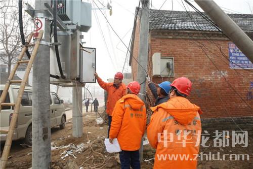 图为1月16日,县桐丘电力工程有限公司工程三部施工人员正在对汴岗镇水泉村进行变压器更换和高、低压线路改造施工。