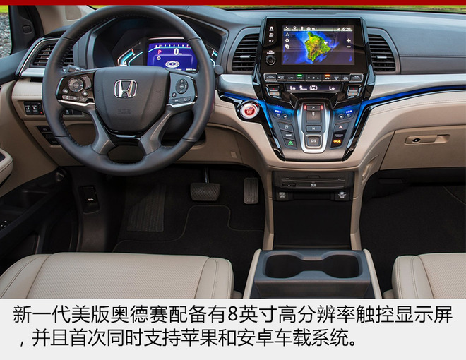 内饰方面,新一代美规奥德赛配备有8英寸高分辨率触控显示屏,并且首次同时支持苹果和安卓车载系统,后排也安装有10.2英寸液晶显示屏,通过内置应用程序可使乘客看到实时出行进度。同时,新车的多媒体影音系统还支持4G LTE、WiFi和USB连接。此外,新车还配备有脚踢感应开启尾门、安全超感系统、液晶仪表盘、魔术座椅以及手机无线充电板等。