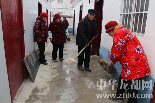 记者看到,一位老人正在用木棍敲打屋檐上垂下的“冰棍“,以免“冰棍”落下伤人,还有几位老人在清扫剩下的一点点积雪,他们有说有笑,很是热闹,场面煞是温馨。