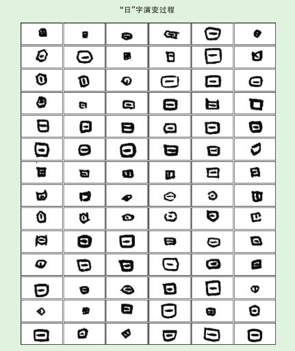 “日”,在六书中属象形字。甲骨文、金文都像太阳的形状。古人写字,都是用刀笔刻在甲骨上。太阳本是圆形,但刻写易方不易圆,因而“日”字写成方形。其中的一点,象征太阳的光芒。到小篆时期,其中的一点,则演变成了一横。《说文》:“日,实也。太阳之精不亏,从口、一,象形。”