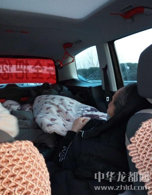 在赵明礼车內,患病老翁在女儿孟丽的陪伴下,躺在车上,身体状况良好,大家都期待道路能够尽快畅通。