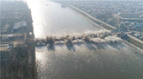 据介绍,项城市老沙河大桥爆破拆除采取毫秒微差延期爆破技术,共使用432公斤炸药,布设了5563眼装药孔。爆破时,释放了巨大的能量,几个桥墩接口处相继闪光,在爆炸声中,老沙河大桥如同多米诺骨牌一样折成几段,依次快速倒塌,几分钟后,沙河水面重新恢复往日的平静。