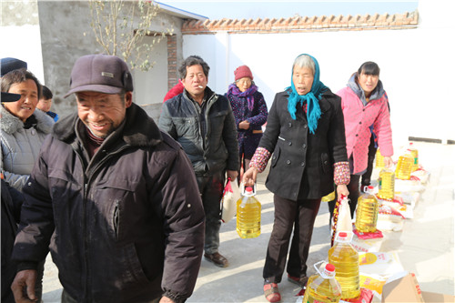 当日上午,虽然天气寒冷,可叶庄行政村村室院里却暖意融融。该村村主任熊茂礼正在把备好的年货发放到49户村民的手中。“非常感谢茂礼这么远回老家看望我们这些困难户,让我们过上一个好年。”现年76岁的村民张多朗是个五保户,接过熊茂礼送上的年货连声道谢。熊茂礼鼓励困难户一定要对生活充满信心,乐观地面对生活。同时,希望困难户要保持良好心态,积极面对困难,自强自立,早日摆脱困境。