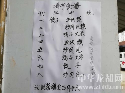午饭时,老人们井然有序地端着馒头、大米粥、小酥肉等在餐厅内就餐。两个刚吃过饭的老人仔细查看贴在食堂门口的《春节食谱》,路过的一位老太太开玩笑说他们吃着碗里看着锅里。李学告诉记者:“从正月初一到正月十五,敬老院的菜谱荤素搭配,每日三餐不重样。5名炊事员一门心思想让老人吃得香、吃得鲜、吃得好。”同时,记者发现在敬老院的前排房间前,两名服务员正推着餐车一间挨着一间为行动不便的老人们送水、送饭。