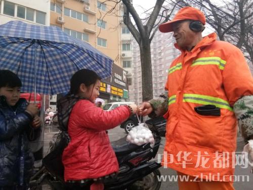 2月27日下午3点,两个小学生模样的小朋友冒雨出现在郑州市三全路与丰庆路口,他们正是“羊肉哥”孙合理的一双儿女。女儿名叫孙梦露,8岁,儿子名叫孙浩,6岁。他们手里提着元宵,一路给辖区环卫工人发放。
