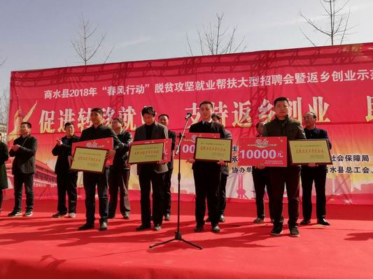 中华龙都网讯(周口报业全媒体记者 付永奇)3月5日上午,商水县“春风行动”招聘会暨农民工返乡创业表彰会在河南阿尔本制衣有限公司举行。来自全县各地的3000多名求职者和30多家招聘单位进行了零距离沟通。