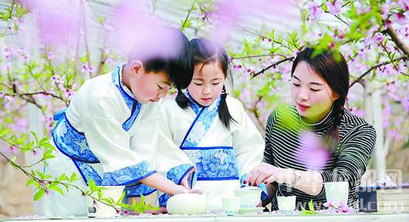 日前,一位年轻的妈妈带着一双儿女在扶沟县韭园镇的一个温室大棚基地学习茶艺。据悉,该基地共有11个桃树温室大棚和200亩露地桃林。在近1个月的花期里,该基地免费向游客开放。前来赏花的游客不但可以在花间弹古筝、拍照,也可以学习茶艺,既欣赏了美景,又陶冶了情操。谷志方 李永超 摄