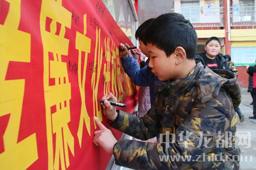 中华龙都网讯(周口报业全媒体记者 韦伟 通讯员 王佳佳 辛曼 摄)今年是毛泽东“向雷锋同志学习”题词55周年。3月5月,沈丘县纪委监委联合县义工联走进沈丘二高、河南小学,开展“孝廉文化进校园”活动,旨在弘扬雷锋精神和“孝善俭廉”的美德。图为:学生们在“弘扬雷锋精神,做‘孝善俭廉’美德少年”条幅前签字。