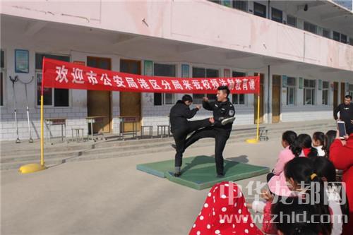 中华龙都网讯 (周口报业全媒体记者 宋风 通讯员 王天晨 文图)3月12日,周口港区郭河小学校园内掌声雷动,学生们在操场上兴奋地观看港区民警演示的“擒敌拳”和防身“格斗术”。这是周口市公安局周口港区分局在辖区学校内开展的十九大精神宣讲和法制教育讲座及自我防范技能课。3月份以来,港区民警已在辖区24所中小学及幼儿园开展此项活动21场。