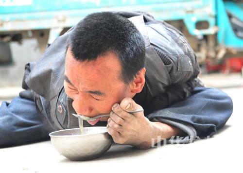 妈妈乘上一碗放在地上,红印坐在垫子上,用脚夹着勺子,弯下腰来吃得很香。看到红印吃饭那么费力,在场人心里酸酸的,为红印自强不息所打动着。可是当初娘俩可没少流眼泪,李新兰发现儿子两只脚是灵活完好的,就开始训练他用脚吃饭、洗脸。养大一个正常的孩子尚且不易,何况是张红印这样的孩子?李新兰一遍遍地教,年幼的张红印一遍遍地学。难为到受不了时,娘俩就抱在一起哭。