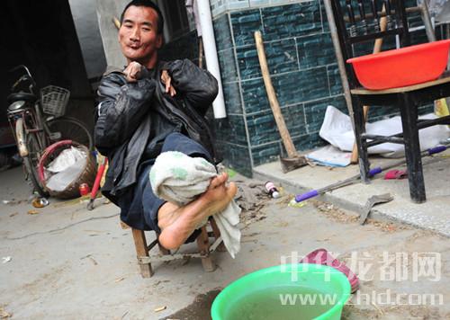 从十岁起,红印就帮着妈妈烧锅做饭,用脚学着点火,朝锅底里续柴火,慢慢长大后,自己学会吃饭、洗衣、看家、简单种菜,有时候还能修理个邻居给的小玩具和小家电。他虽然不会说话,但能听懂家里人的话意。红印的爸爸今年68岁,提起红印也愁也喜,“家里人都忙,几个孩子相继成家,我还有几亩地要种,平时顾不上他,他自己也学着做些事情,真难为他啦!”