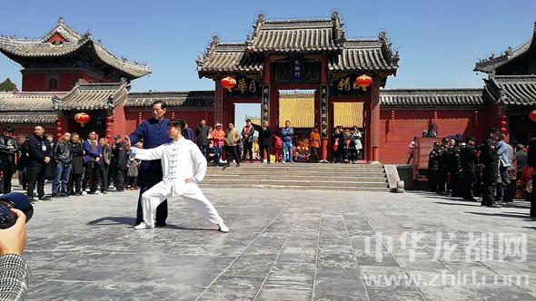研讨会前,王西安大师率弟子在淮阳太昊陵庙太极门前向海内外太极拳爱好者传授拳术。