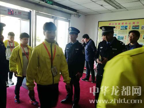 在市体育馆的入口处设有安检门,门口两侧各有4名民警检查进入场馆的人员证件,无论是工作人员还是运动员、裁判员都必须凭组委会发放的证件方能进入。另有2名民警手持金属探测仪,在进入的人员身上探测可疑金属,以防止有人误带管制刀具等违禁品进入场馆内。进入当日举行举重比赛的场馆后,记者看到有身穿警服的民警在现场不时走动,维持赛场秩序。